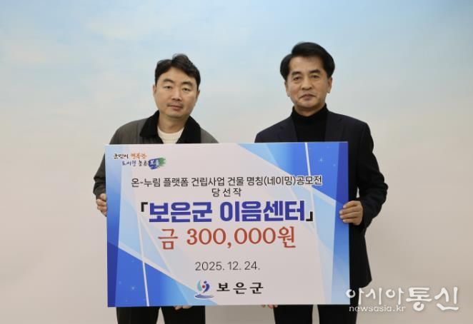 [아시아통신] 충북 보은군은 생애주기별 복지서비스 제공을 위한 ‘온-누림 플랫폼(가칭)’의 공식 명칭으로 ‘보은군 이음센터(응모자 박준표)’를 최종 선정하고 24일 시상식을 개최했다.