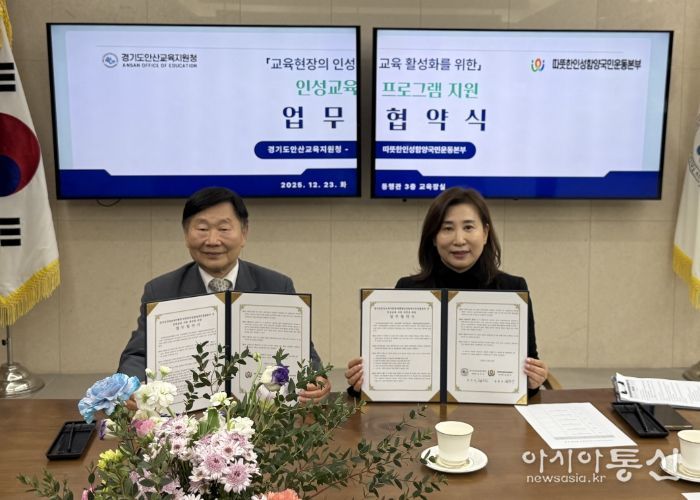 [아시아통신] 경기도안산교육지원청은 12월 23일 오후 3시 30분, 따뜻한인성함양국민운동본부와 학교 현장의 인성교육 강화와 도덕성 회복을 위한 지역 연계형 인성교육 지원 체계 구축을 위한 업무협약(MOU)을 체결했다.