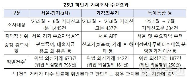 이번 기획조사는▴서울·경기 주택 이상거래(’25.5월~6월 거래신고분),▴부동산 실거래가 띄우기(’23.3월~’25.8월 거래신고분), ▴특이동향 등(’25.1월~7월 거래신고분) 3가지 분야에 대해 실시됐다.