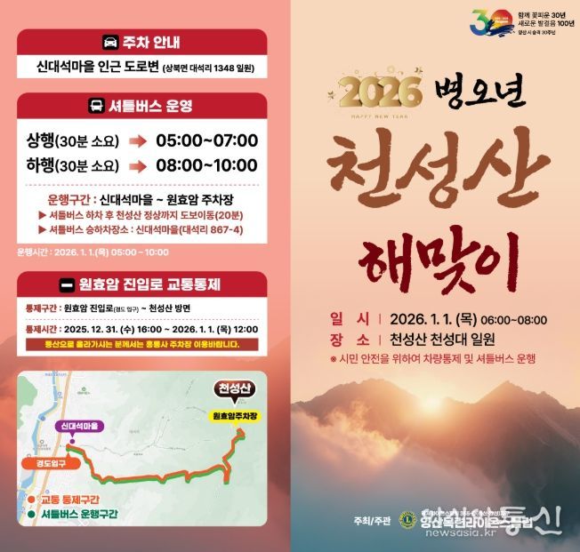 [아시아통신] 양산시는 올해로 3번째를 맞는 양산 천성산 해맞이 행사가 양산목련라이온스클럽(국제라이온스협회 355-D 양산지구 제3지역 소속)의 주최·주관으로 2026년 1월 1일 천성산 천성대 일원에서 개최된다고 밝혔다.