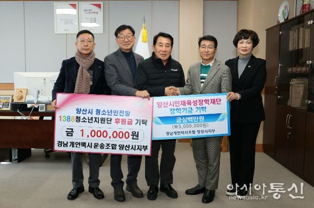 [아시아통신] 경남개인택시조합 양산시지부(지부장 장태영)은 26일 양산시를 방문해 인재육성장학재단(이사장 이희종)에 장학금 300만원과 1388청소년지원단에 후원금 100만원을 기탁했다.