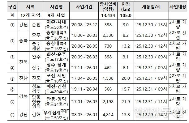 이번에 개통을 앞둔 12개 지역 9개 국도 사업(105km)은 상습 교통정체 완화, 교통사고 예방 및 대중교통 이용성 향상 등을 위해 추진했으며, 사업비는 총 13,434억원을 투입했다.
