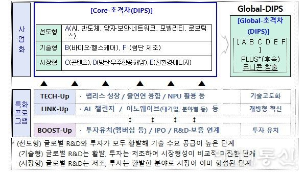 「초격차 프로젝트」는 기본지원(Core-DIPS)과 후속지원(Global DIPS) 등 2단계로 나누어 지원하며, 기술고도화(Tech Up), 개방형 혁신(Link Up),