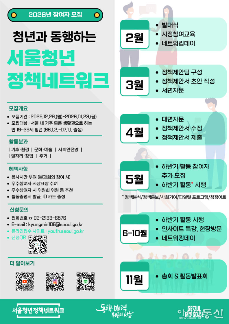 서울시는 청년이 서울시정에 참여해 정책을 제안하는 서울청년정책네트워크(이하 ‘청정넷’) 신규 위원 350명을 모집한다. 신청기간은 2025.12.29.(월)부터 2026.1.23.(금)까지이고, 청년몽땅정보통(https://youth.seoul.go.kr)에서 접수를 받는다.