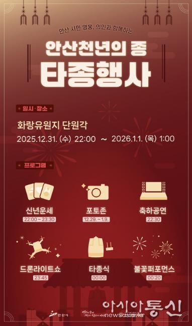 [아시아통신] 안산시는 오는 31일 오후 10시부터 화랑유원지 단원각에서 ‘2026 안산 천년의 종 타종 행사’를 개최한다고 30일 밝혔다.