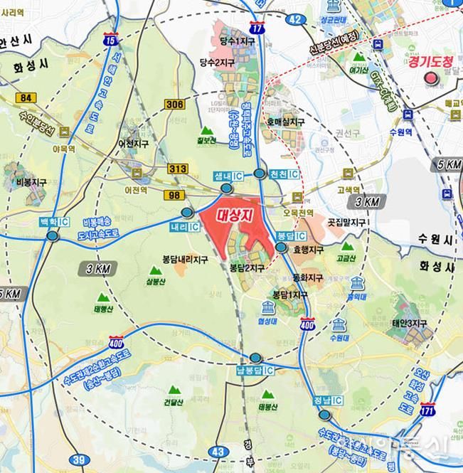 봉담3지구는 화성시 봉담읍(상리·수영리·내리) 및 매송면(천천리·원평리) 일원에 조성되며, 면적은 2,289,715㎡다.