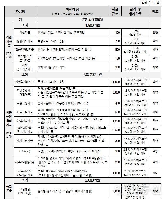 자금 유형별로는 ▴중소기업육성기금 재원으로 융자해 주는 ‘직접 융자금(고정금리)’ 1,800억 원 ▴시중은행 재원으로 자금을 융자, 대출금리 이자 일부를 서울시가 보전하는 ‘시중은행 협력자금(변동금리, 이자차액보전)’ 2조 200억 원 ▴마이너스통장 방식의 ‘안심통장(특별보증)’ 2,000억 원을 각각 공급한다.