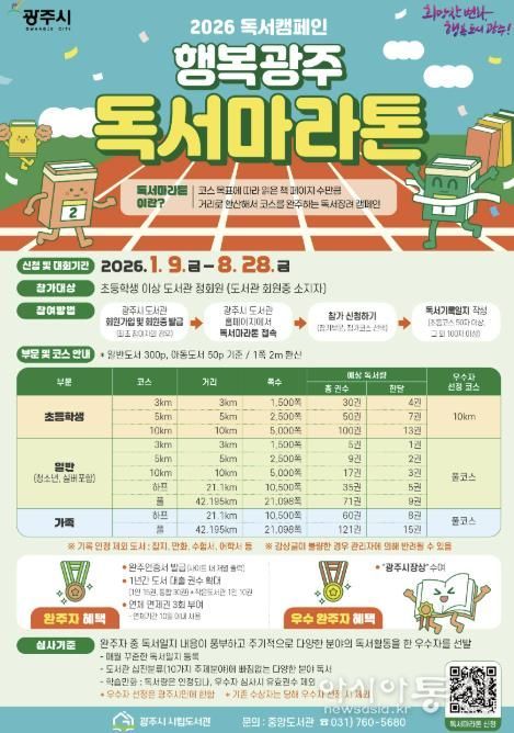 [아시아통신] 광주시도서관은 독서 문화 확산을 위한 독서 장려 캠페인 ‘2026년 행복 광주 독서 마라톤’을 오는 9일부터 시작한다고 5일 밝혔다.