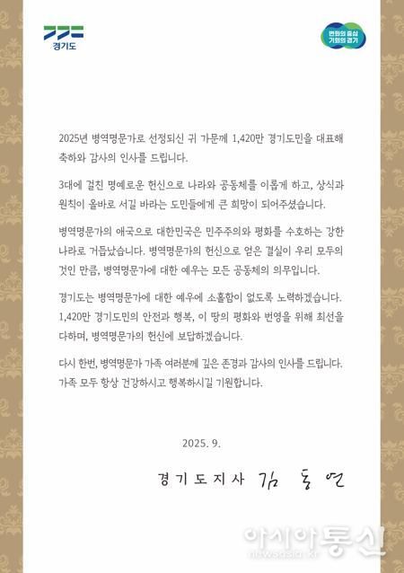 김동연 경기도지사는 서한문을 통해 “병역명문가의 애국으로 대한민국은 민주주의와 평화를 수호하는 강한 나라로 거듭났다”면서 “경기도는 병역명문가에 대한 예우에 소홀함이 없도록 노력하겠으며, 헌신에 보답하겠다”고 감사와 존경의 뜻을 표현했다.