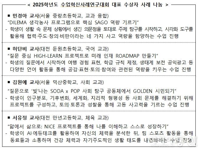 [아시아통신] 교육부와 한국교육과정평가원(원장 직무대리 박은아)은 1월 7일, 엘타워(서울)에서 수상자와 교육청 관계자 등이 참석한 가운데 ‘2025학년도 수업혁신사례연구대회 시상식’을 개최한다.