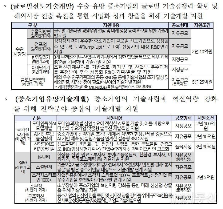 우선 ‘수출지향형’ 사업은 글로벌 시장 경쟁력 확보를 위해 기업당 최대 2년간 10억원을 지원한다. 특히 올해부터는 기존 124개 전략품목으로 제한했던 기술 분야를 전격 폐지해 중소기업이 자율적으로 혁신적인 과제를 제안할 수 있도록 했다. 다만 12대 국가전략기술이나 탄소중립 분야 등 전략기술 과제에 대해서는 평가 시 우대하여 정책적 일관성을 유지할 방침이다.