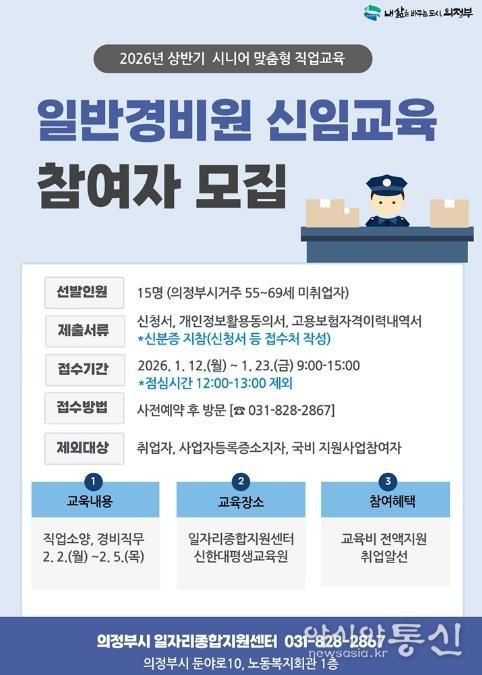 [아시아통신] 의정부시는 관내 시니어 세대의 재취업을 지원하고 안정적인 일자리를 연계하기 위해 ‘일반경비원 신임교육’ 참여자를 모집한다.