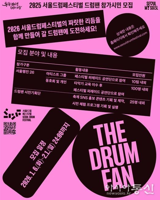 [아시아통신] 서울시는 오는 5월 동대문디자인플라자(DDP)에서 개최되는 ‘2026 서울드럼페스티벌’을 앞두고 축제의 주인공으로 활약할 ‘드럼팬(Drum Fan)’ 시민 참여자를 2월 1일까지 모집한다. 올해 축제는 단순 관람을 넘어 시민이 직접 기획하고 참여하는 ‘시민 주도형’ 축제가 될 것으로 기대된다.
