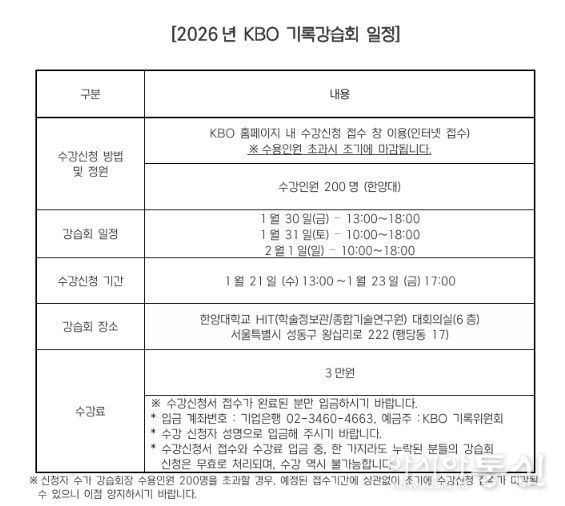 [아시아통신] 2026년 KBO 기록강습회가 1월 30일(금)부터 2월 1일(일)까지 서울 한양대학교에서 개최된다. 기록강습회는 야구 공식기록법의 보급과 이해를 통한 저변 확대를 목적으로 프로야구 원년인 1982년부터 개최됐다.