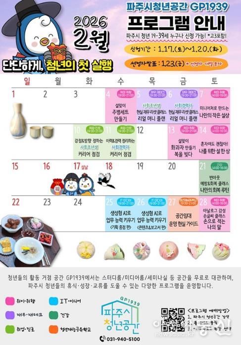 [아시아통신] 파주시청년공간 지피(GP)1939가 오는 2월 한 달간 청년을 위한 맞춤형 프로그램에 참여할 참여자를 모집한다.