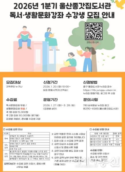 [아시아통신] 울산 중구에서 운영하는 울산종갓집도서관이 2026년 1분기 독서·생활문화강좌 수강생을 모집한다