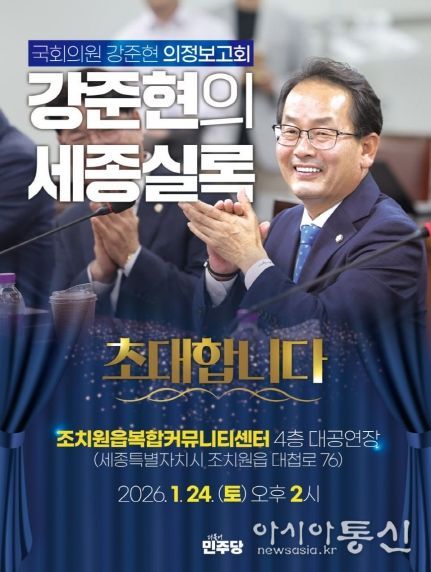 [아시아통신] 더불어민주당 강준현 국회의원(세종시을)이 2026년 1월 24일 오후 2시, 조치원복합커뮤니티센터 대공연장(조치원읍 대첩로 76)에서 의정보고회를 연다.