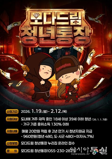 [아시아통신] 경상남도와 경남투자경제진흥원은 청년의 자산 형성과 지역 정착을 돕는 ‘모다드림 청년통장’ 상반기 참여자를 1월 19일부터 2월 12일까지 모집한다고 밝혔다.