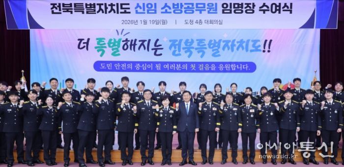 [아시아통신] 전북특별자치도는 19일 도청 4층 대회의실에서 2026년 신임 소방공무원 임명장 수여식을 열고, 도민의 생명과 안전을 지킬 신임 소방공무원 45명을 공식 임명했다.