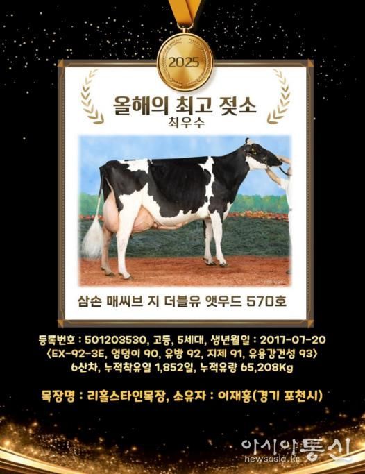 [아시아통신] 포천시는 관내 낙농농가인 리홀스타인목장(대표 이재홍)이 2025년 ‘올해의 최고 젖소’를 배출했다고 밝혔다.