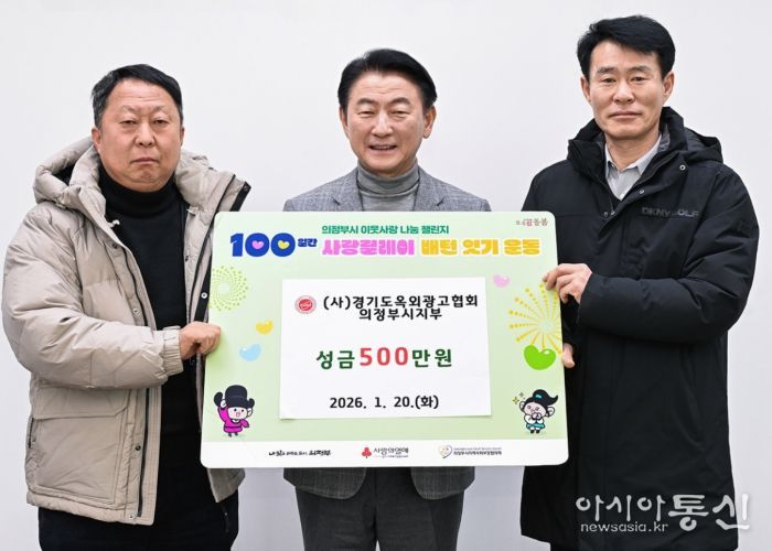 [아시아통신] 의정부시는 1월 20일 (사)경기도옥외광고협회 의정부시지부가 ‘100일간 사랑릴레이 배턴 잇기’에 동참해 성금 500만 원을 기탁했다고 밝혔다.