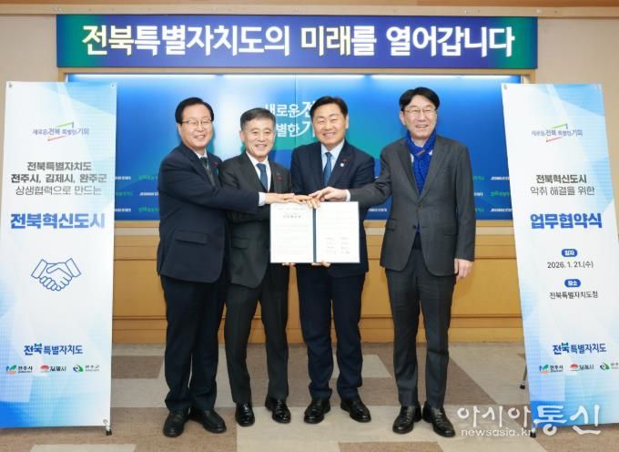 [아시아통신] 완주군이 21일 전북특별자치도청에서 전북특별자치도, 전주시, 김제시와 함께 혁신도시 악취 문제 해결을 위한 업무협약을 체결했다.
