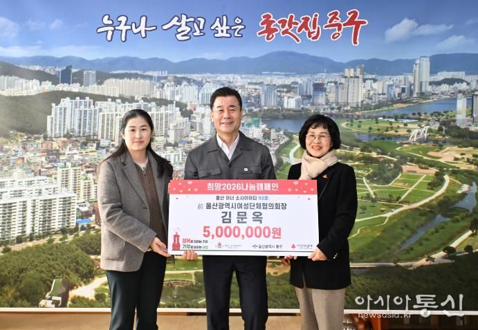 [아시아통신] 울산 제93호 아너소사이어티 회원인 김문옥 씨가 1월 21일 오전 10시 30분 중구청 구청장실을 찾아 울산사회복지공동모금회를 통해 이웃돕기 후원금 500만 원을 전달했다.
