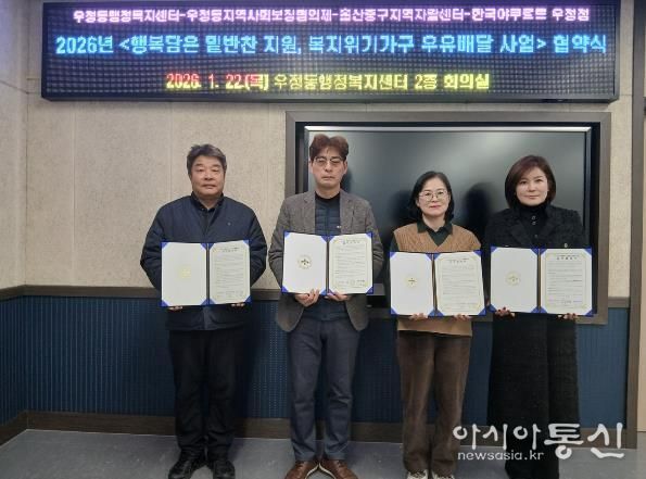 [아시아통신] 울산 중구 우정동 행정복지센터와 우정동 지역사회보장협의체가 지난 1월 22일 오후 4시 우정동 행정복지센터 회의실에서 울산중구지역자활센터와 ‘행복담은 밑반찬 지원 사업’, 한국야쿠르트 우정점과 ‘복지위기가구 우유배달 지원사업’ 업무협약을 체결했다.