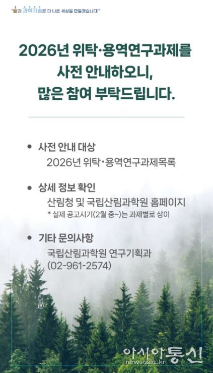 [아시아통신] 산림청 국립산림과학원은 산림 연구 인프라를 내실화하고, 대학 및 연구기관과의 전략적 협업을 확대하기 위해 2026년 위탁·용역연구과제를 사전 안내한다고 밝혔다.