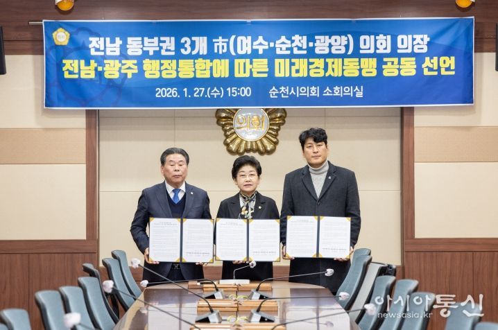 [아시아통신] 광양시의회 최대원 의장은 지난 27일 전라남도와 광주광역시의 행정통합 논의가 본격화되고 있는 가운데, 백인숙 여수시의회 의장, 강형구 순천시의회 의장과 함께 전남·광주 행정통합에 따른 전남 동부권의 공동 발전과 미래 경쟁력 강화를 위한 '전남 동부권 미래경제동맹 공동 선언문'을 발표했다.