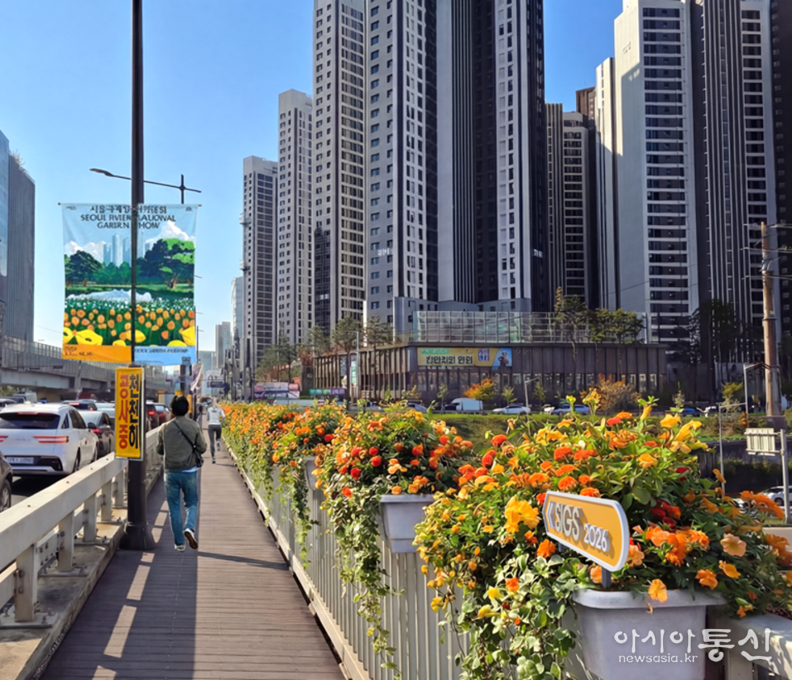(고가 하부) 지상철 구간인 지하철 2호선(뚝섬역~성수역) 하부의 거대한 콘크리트 교각에는 2026년 서울색 모닝옐로우와 그래픽을 입히는 ‘교각 랩핑·페인팅’을 도입하고, 성동교와 응봉교 등 교량 난간에는 440여 개의 ‘걸이형 화분’을 설치해 공중에서도 꽃을 즐길 수 있게 한다.