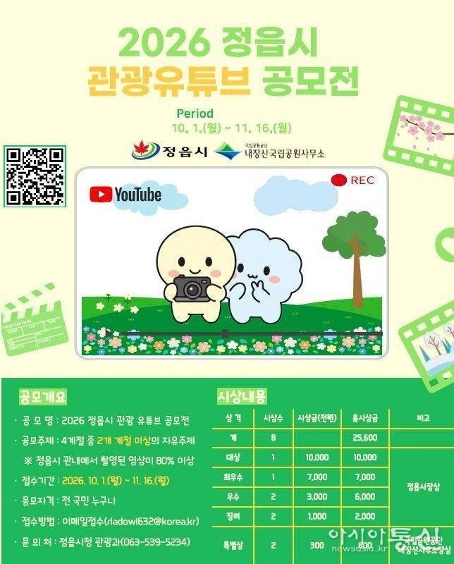 전북 정읍시가 지역 관광자원을 전국에 알리고 관광 수요를 확대하기 위해 ‘2026 정읍시 관광 유튜브 공모전’을 개최한다고 28일 밝혔다.
