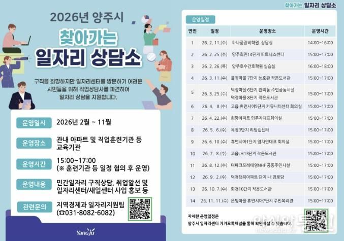 [아시아통신] 양주시가 구직 현장의 문턱을 낮추고 시민들의 취업 성공률을 높이기 위해 오는 11월까지 ‘2026년 찾아가는 일자리 상담소' 를 운영한다.