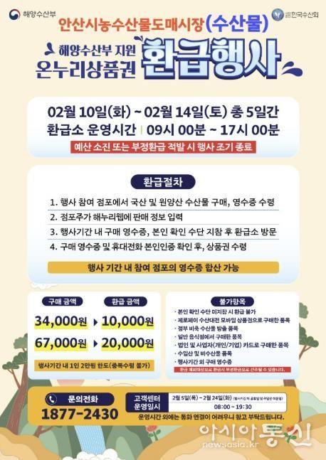 [아시아통신] 안산시는 설 명절을 맞아 국산 수산물 소비 촉진과 도매시장 활성화를 위해 오는 10일부터 14일까지 5일간 ‘2026년 설 온누리상품권 환급행사’를 개최한다고 5일 밝혔다.