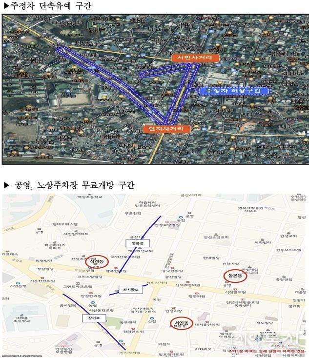 주정차 단속 유예 구간은 안성맞춤시장(서인사거리~인지사거리 구간 양측 300미터)과 중앙시장(서인사거리~안성농협 양측 100미터, 석정삼거리~인지사거리 양측 500미터) 주변 도로이며, 서인동·동본동·석정동의 건축식 공영주차장과 전통시장 주변 노상주차장이 무료 개방된다.