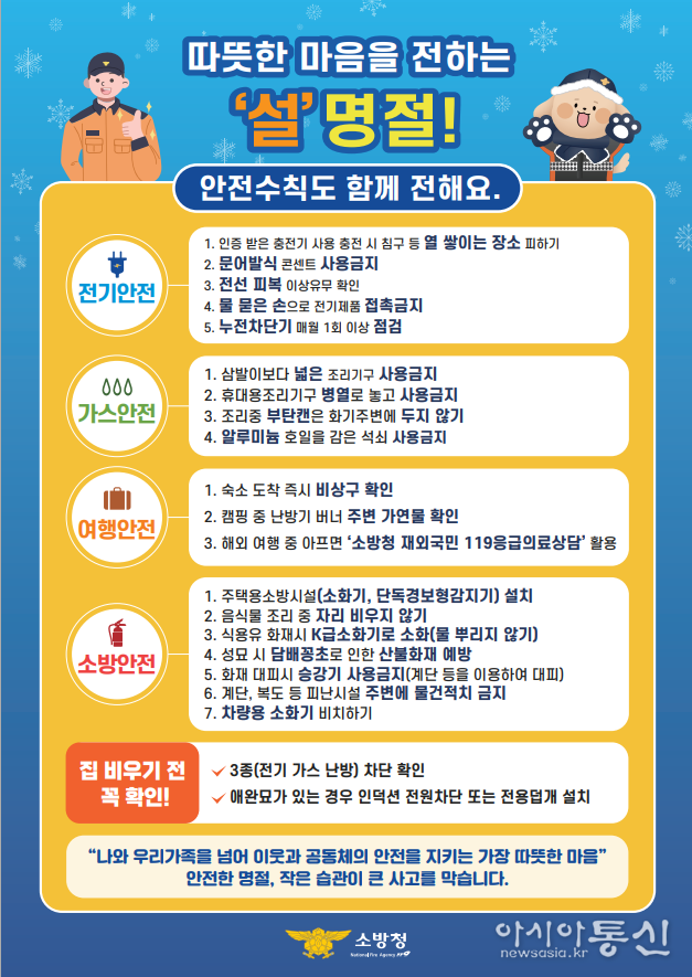 또한 소방차 출동로 확보를 위해 명절 기간 불법 주·정차 단속을 강화하고, ‘주택용 소방시설’ 설치 홍보를 통해 시민들의 자율적인 안전 확보를 독려한다.