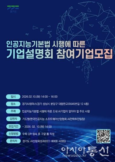 [아시아통신] 경기도가 지난 1월 22일 시행된 ‘인공지능 기본법’에 대한 도내 기업들의 이해를 돕기 위해 10일 오후 2시 판교 경기AI캠퍼스에서 AI 기업 대상 설명회를 개최한다.