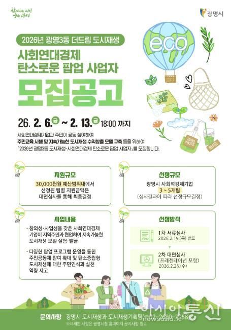 시는 오는 3월부터 12월까지 광명3동 더드림 도시재생사업의 일환인 ‘2026년 광명3동 도시재생-사회연대경제 탄소로운 팝업 사업’을 추진한다고 10일 밝혔다.