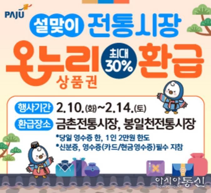 [아시아통신] 파주시는 2026년 설 명절을 맞아 고물가로 인한 시민들의 가계 부담을 덜고 지역 전통시장 활성화를 도모하기 위해 ‘설맞이 농축산물 온누리상품권 환급 행사’를 실시한다.