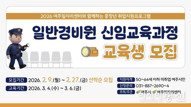 [아시아통신] 여주시는 중장년층의 재취업을 돕기 위해 2026년 여주시 중장년 일반경비원 신임교육과정 교육생을 모집한다고 밝혔다.