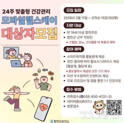 [아시아통신] 합천군은 2월 11일부터 2026년 모바일 헬스케어 참가자 100명을 선착순으로 모집한다.