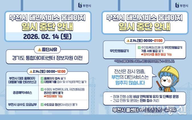 시는 서비스 중단 이전에 홈페이지·블로그·사회관계망서비스(SNS) 및 무인민원발급기 안내문을 통해 관련 내용을 알리고, 대체 이용 방법을 알리고 있다. 또한 설 연휴 동안 문의가 많은 생활 정보는 부천시 블로그 등 대체 채널을 통해 지속 안내하고, 당직 민원은 무선통신망을 활용해 차질 없이 대응할 방침이다.