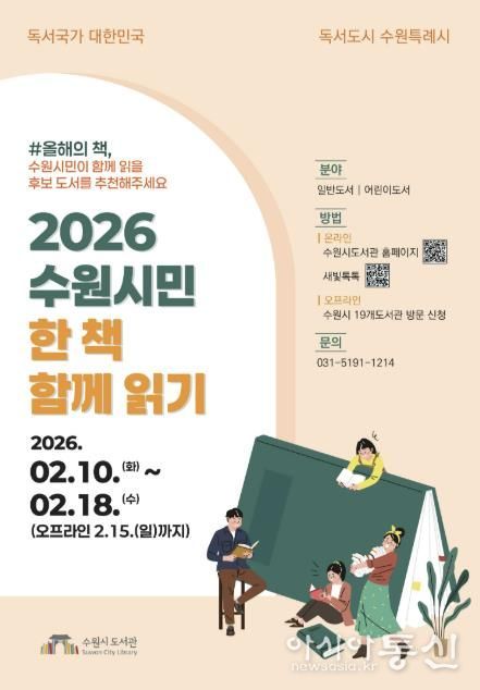 [아시아통신] 수원시도서관이 ‘2026 수원시민 한 책 함께 읽기’ 올해의 책 후보 도서를 2월 18일까지 추천받는다. 수원시민 누구나 추천할 수 있다.
