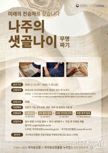 [아시아통신] 국가유산청은 국가유산청 산하 국가유산진흥원과 2월 11일부터 3월 20일까지 단절 위기의 국가긴급보호무형유산인 '나주의 샛골나이(무명짜기)'의 미래 전승자 발굴을 위한 공모를 진행한다.