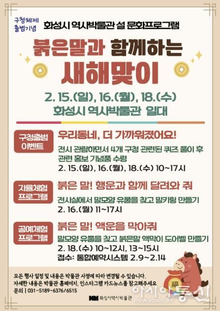 [아시아통신] 화성특례시는 설 연휴 기간인 오는 2월 15일부터 18일까지 화성시 역사박물관에서 ‘붉은 말과 함께하는 새해맞이’ 설날 문화프로그램을 운영한다.