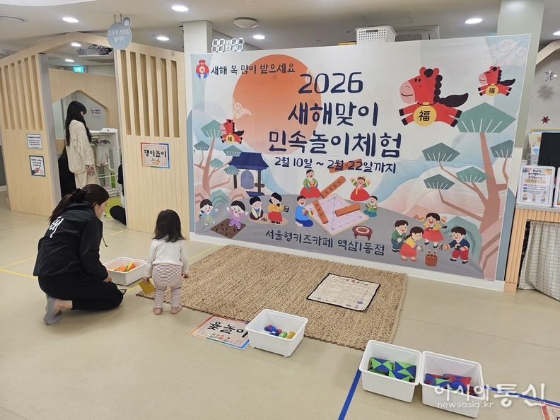 설맞이 프로그램은 역삼1동점에서 진행한다. 민속놀이존에서는 윷놀이와 사방치기 등 전통놀이를 아이들이 직접 체험할 수 있도록 구성했다. 전통 혼례를 주제로 한 특별 프로그램도 같은 기간 운영해, 겨울철 실내 놀이에 명절 분위기와 문화 체험 요소를 더했다.