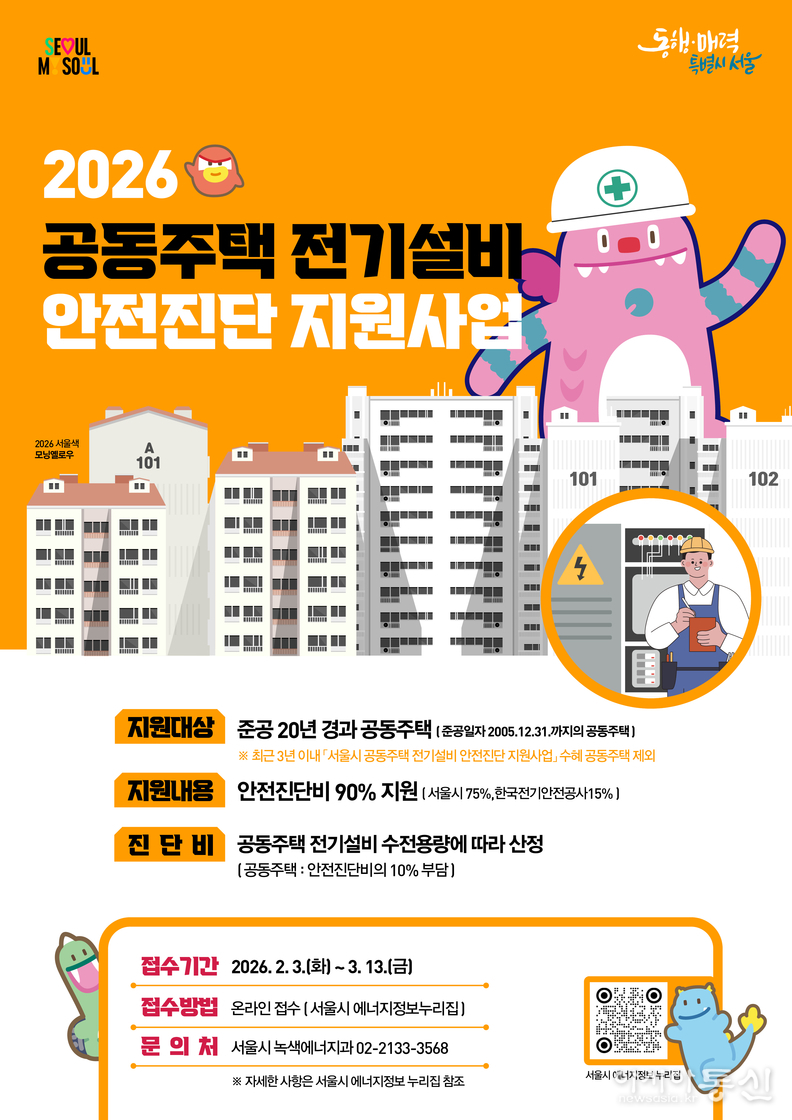 서울시는 노후 공동주택의 정전사고를 사전에 차단하고, 시민 생활안전을 강화하기 위해 ‘2026년 공동주택 전기설비 안전진단 지원사업’을 추진한다. 한국전기안전공사와 협력해 공동주택 전기설비의 적정 운전․관리 상태를 종합 진단하고, 진단비의 90%를 지원한다.