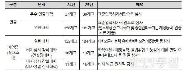 한편, 인증대학 외에 외국인 유학생이 1명 이상 재적 중인 대학에 대해서는 ‘유학생 유치‧관리 실태조사’를 실시하고, 일정 기준을 충족하지 못할 시 비자심사 강화대학(컨설팅대학, 비자정밀 심사대학)으로 지정했다. 이를 통해 대학이 외국인 유학생의 유치 단계에서 어학 능력과 재정 능력 등을 엄격히 심사하도록 하고, 유학생 관리 전반에 대한 대학의 책임을 강화할 예정이다.