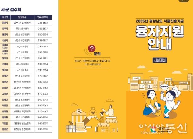 [아시아통신] 경상남도는 도내 식품위생업소를 대상으로, 노후 영업장 개선과 위생 설비 확충을 지원하는 ‘식품진흥기금 시설개선 융자사업’을 추진한다고 밝혔다.