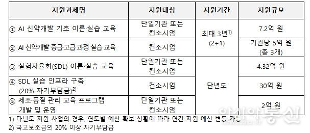 이번 공모를 통해 최대 7개 수행기관을 선정하며, 지원기간은 과제별로 구분하여 지원한다. 지원과제는 AI 신약개발 기초 이론·실습 교육, 중급·고급 과정 실습 교육, 실험자율화 이론·실습 교육, 실험자율화 실습 인프라 구축, 제조·품질 관리 교육까지 총 5개 단위이다.